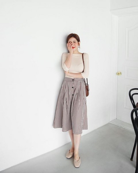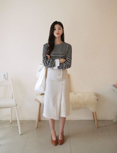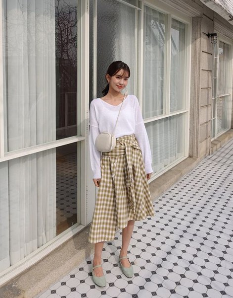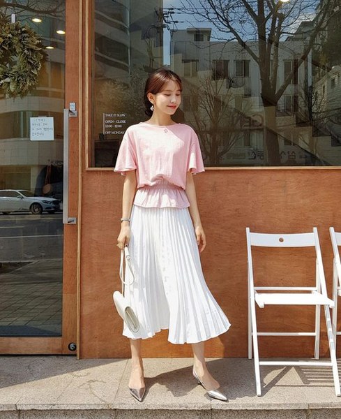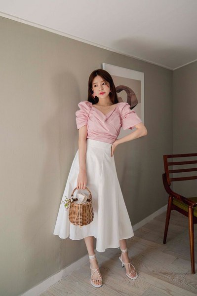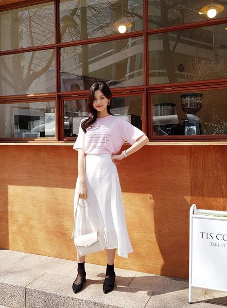 Các mẫu chân váy midi tông trắng, thiết kế trên các chất liệu nhẹ tênh cũng là sản phẩm ‘cháy hàng’ ở mùa hè năm nay. Nhiều fashionista Hàn Quốc thích diện trang phục này cùng các mẫu áo thun hay blouse màu đơn sắc.