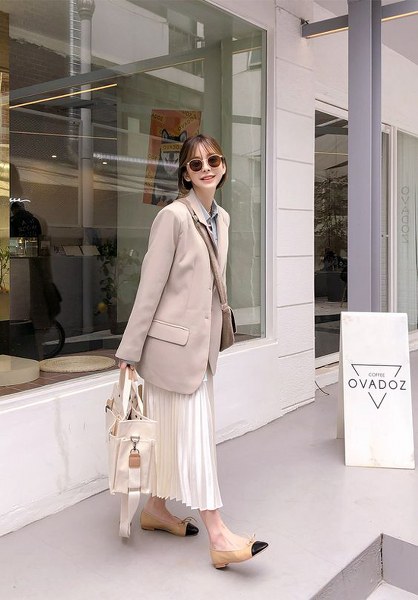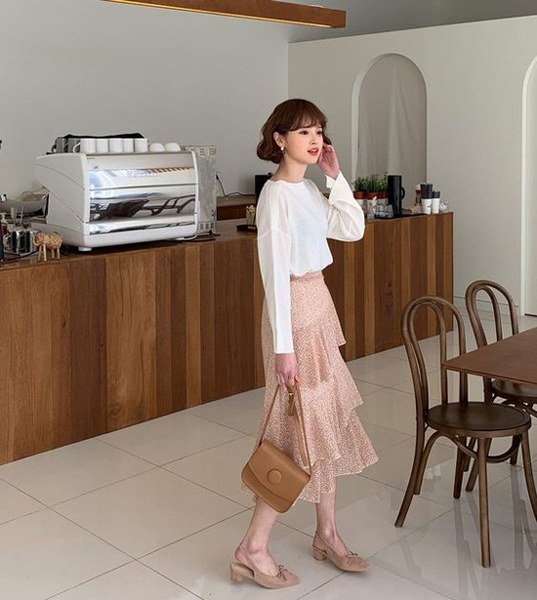 Set đồ mùa hè tiện lợi đi làm và dễ sử dụng khi hẹn hò cà phê cho bạn gái công sở gồm áo cổ trụ dài tay, chân váy xếp tầng, giày hở gót và túi xách tay.