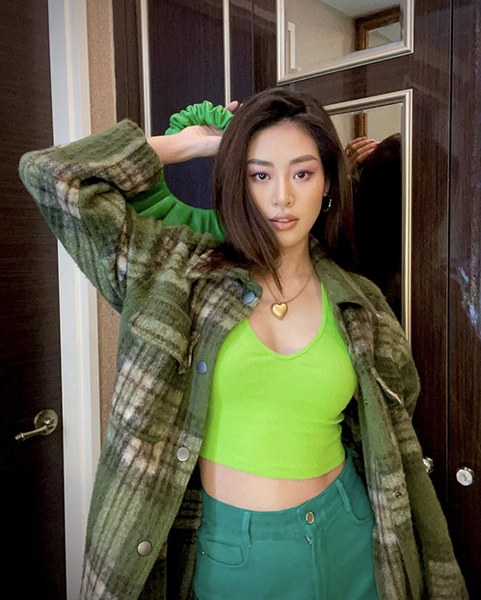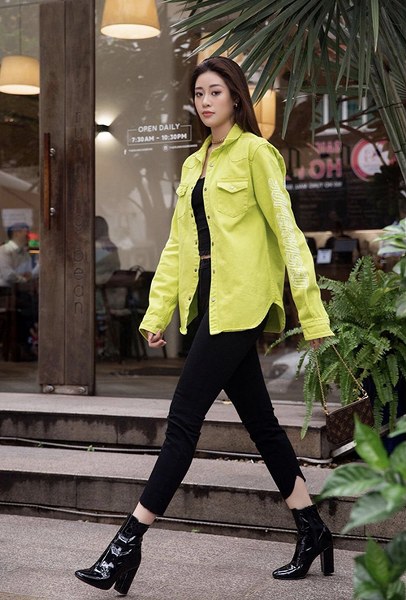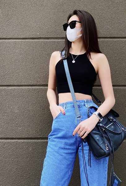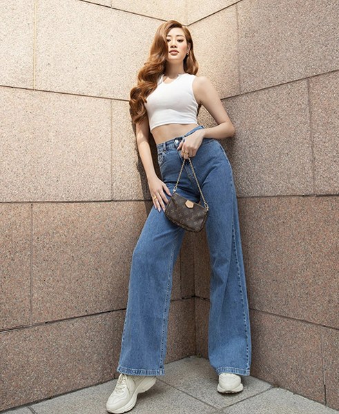 Điểm lưu ý khi diện áo hở eo ra đường là nên chọn các mẫu quần jeans lưng cao như Khánh Vân để phối đồ.