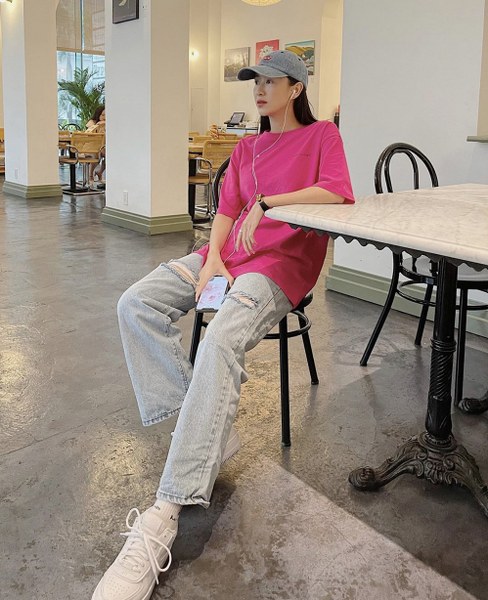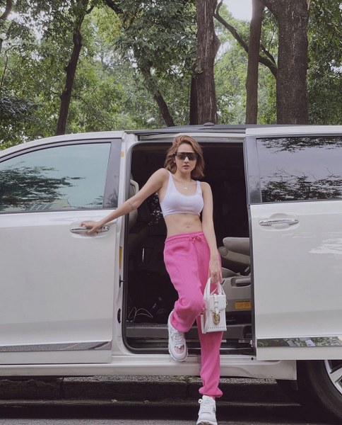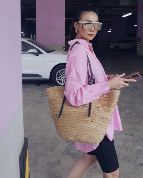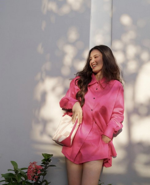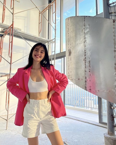 Bên cạnh việc phối combo hồng – trắng hay hồng – đen, các thiết kế trên màu pastel còn có thể kết hợp cùng chân váy hay short gam xanh dương, xanh nany như của Minh Hằng.