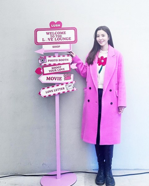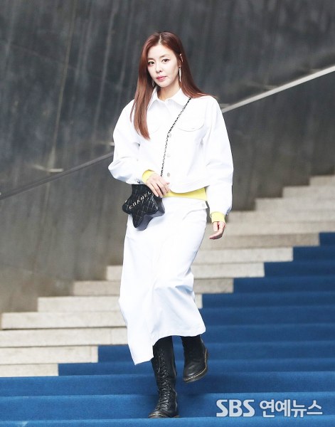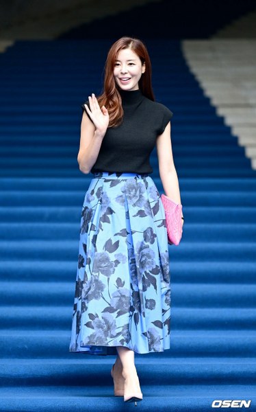 Kim Gyu Ri là khách mời tại Tuần lễ thời trang Seoul, Hàn Quốc, ngày 7/9. Cô phối áo cổ lọ ngắn tay với váy xếp ly bản to họa tiết hoa, phối clutch hồng và đôi cao gót pastel.