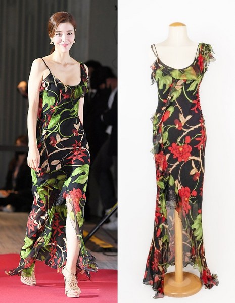 Cô lăng xê thiết kế họa tiết hoa Dior trên thảm đỏ Buil Film Awards lần 31, ở Busan, Hàn Quốc.