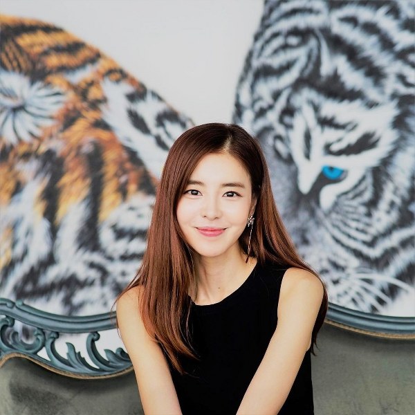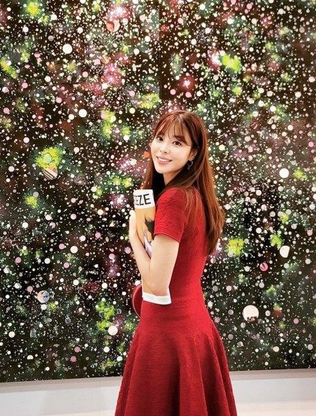 Người đẹp chọn đầm đỏ của một thương hiệu bình dân Hàn Quốc, khi xem triển lãm tranh. Tóc mái ngang giúp diễn viên "ăn gian" tuổi.