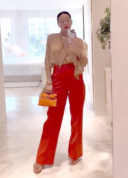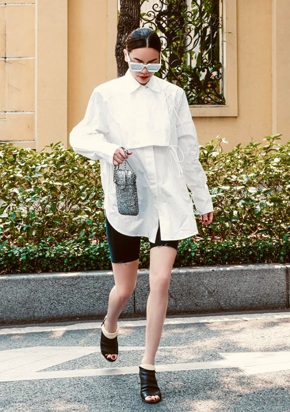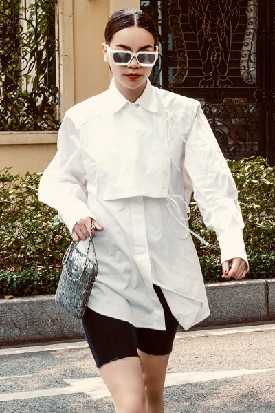 Set đồ đến công ty mới đây của người đẹp được khen vì ứng dụng nhiều hot trend. Nữ ‘tổng tài’ phối sơ mi cách tân oversized cùng quần biker shorts. Phụ kiện đi kèm là mắt kính gọng trắng to bản, tăng nét sang chảnh.