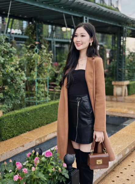 Chân váy da, áo dạ, boots cổ cao là lựa chọn của Quế Anh vào những ngày thời tiết giao mùa.