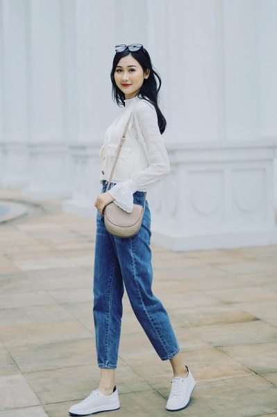 Cô chọn crop top tôn eo thon 62 cm, phối quần jeans ống đứng.