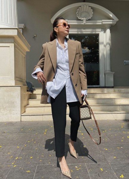 Một trong những món đồ được Thanh Hằng yêu thích là quần vải dáng baggy, từng được mặc với sơ mi và blazer, giày gót nhọn, giúp cô thể hiện sự thanh lịch.