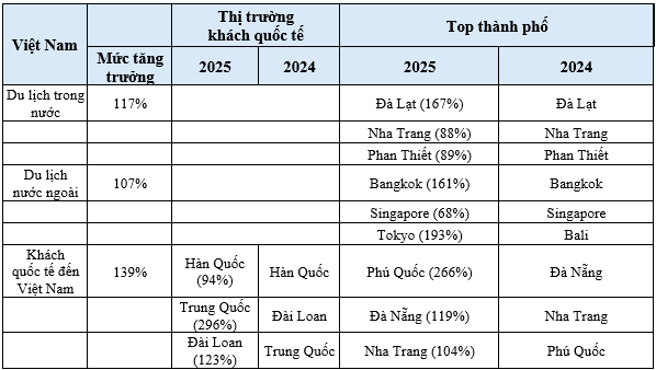 Trong khi đó, Đà Lạt, Nha Trang và Phan Thiết tiếp tục khẳng định vị thế là những điểm đến trong nước hàng đầu, với lượng tìm kiếm lần lượt tăng 167%, 88% và 89%.