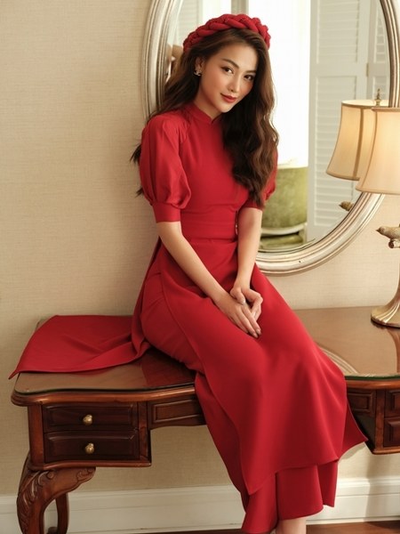 Phương Khánh chọn áo dài màu đỏ, kiểu dáng trơn của nhà thiết kế Lucie Nguyễn. Tay áo bồng cách điệu tạo thành điểm nhấn trên trang phục.