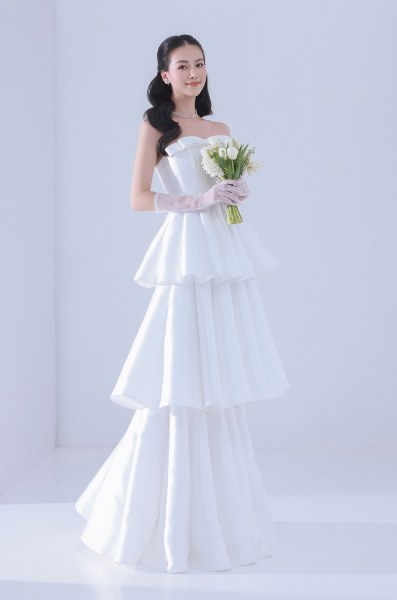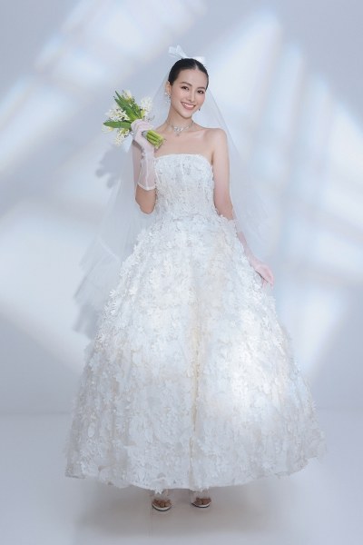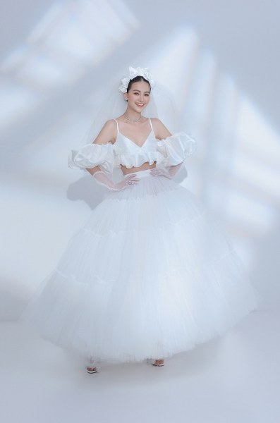Cô được nhà mốt chọn làm "nàng thơ" thể hiện bộ sưu tập "Yes I Do", tung ngày 17/4. Nguyễn Minh Công cách điệu áo crop top kết hợp chân váy xòe, khăn voan. Nhà thiết kế muốn mang đến cho các cô dâu thêm lựa chọn, bớt an toàn, phù hợp tính cách.