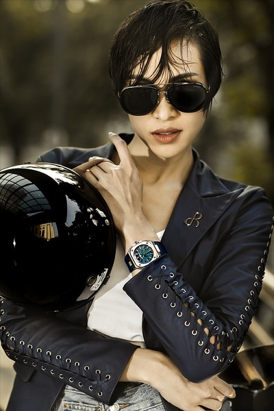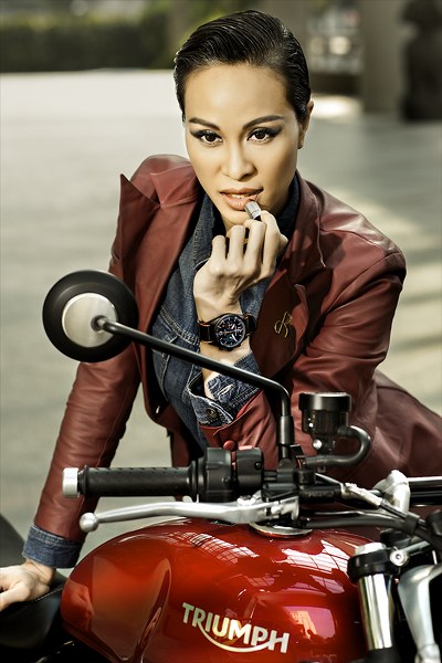 MC kiêm siêu mẫu Phương Mai khoe vẻ cá tính khi mặc đồ da, đeo đồng hồ nam và tạo dáng bên xe phân khối lớn.
