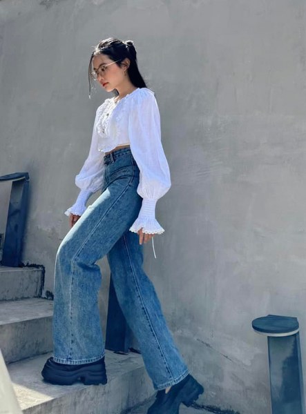 Á quân Giọng hát Việt nhí 2013 chuộng phong cách năng động khi phối quần jeans cạp cao với áo crop top, giày loafers.