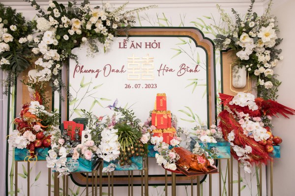 Trong khi đó, Phương Oanh mặc áo dài đỏ thêu hoa sen của Hoa hậu Ngọc Hân trong ngày trọng đại.
