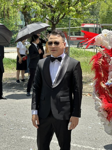 Chú rể Nguyễn Hoà Bình được gia đình Phương Oanh khen trẻ trung, phong độ khi mặc vest do Hoa hậu Ngọc Hân thiết kế riêng.