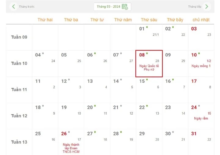 Theo lịch thì ngày Quốc tế Phụ nữ 8/3 năm 2024 rơi vào thứ Sáu, nhằm ngày 28/1 Âm lịch.