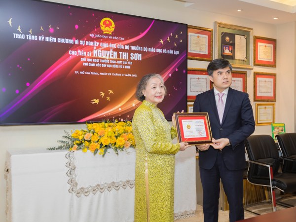 Tiến sĩ Nguyễn Thị Sơn – Chủ tịch HĐQT trường THCS-THPT Duy Tân, Phó Giám đốc Quỹ học bổng Vừ A Dính nhận Kỷ niệm chương "Vì sự nghiệp giáo dục"