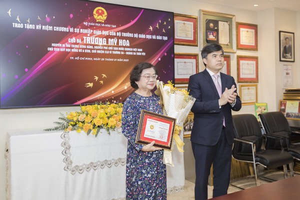 Bà Trương Mỹ Hoa – Nguyên Bí thư Trung ương Đảng, Nguyên Phó Chủ tịch nước CHXHCN Việt Nam, Chủ tịch Quỹ học bổng Vừ A Dính, Chủ nhiệm CLB "Vì Hoàng Sa – Trường Sa thân yêu" nhận Kỷ niệm chương "Vì sự nghiệp giáo dục"