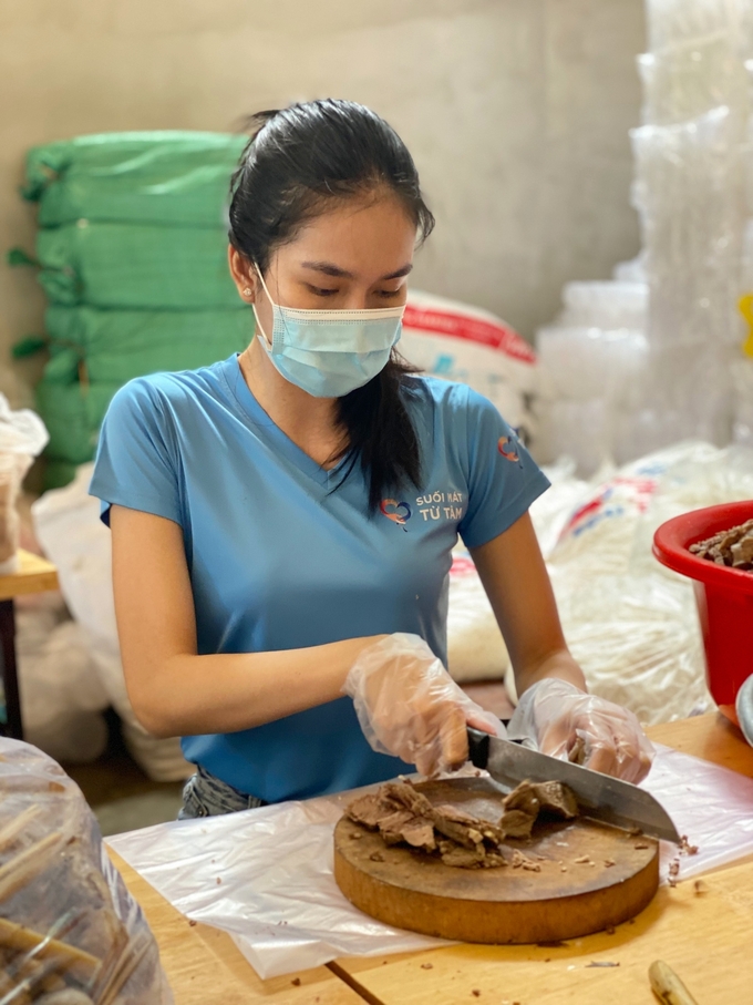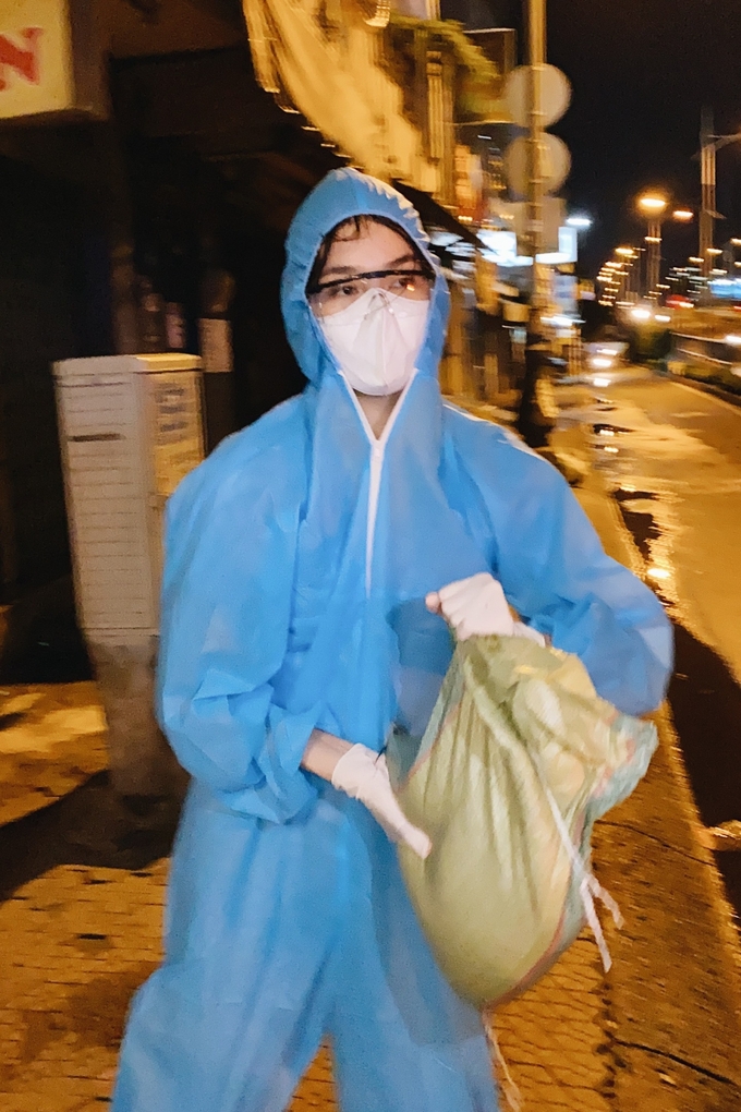 Người đẹp cùng các thành viên CLB Suối mát từ tâm nấu hàng ngàn suất ăn mỗi ngày gửi đến lực lượng y tế, bệnh nhận tại các bệnh viện dã chiến.