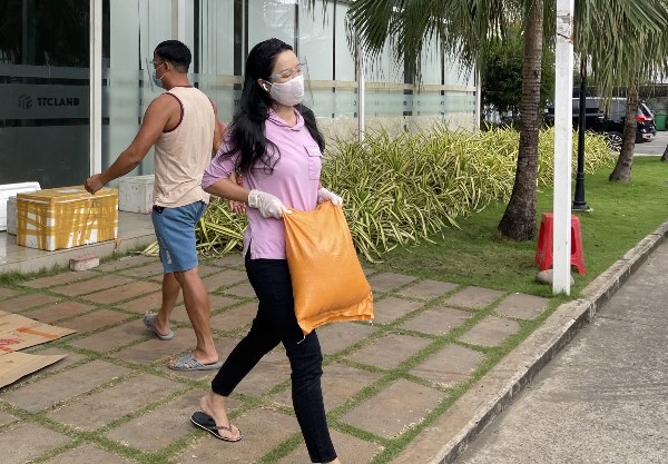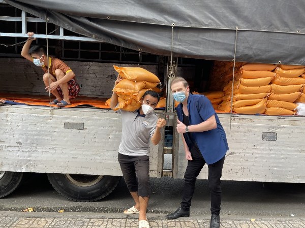 MC Quyền Linh tham gia bốc vác 10 tấn gạo hỗ trợ á hậu Trịnh Kim Chi giúp đỡ các nghệ sĩ gặp khó khăn vì dịch bệnh, hôm 22/9.