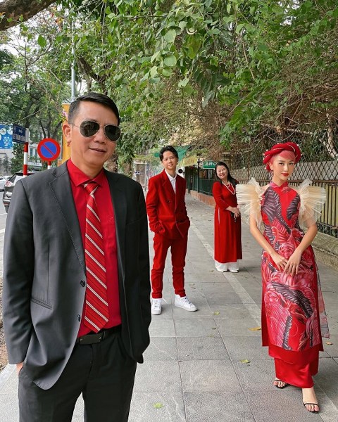 Trang phục Tết 2021 với tông đỏ chủ đạo.
