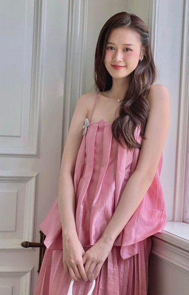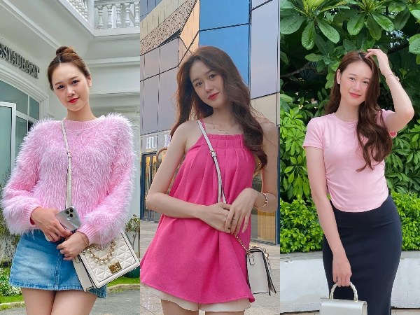Quỳnh Anh yêu thích váy áo gam hồng, đa dạng chất liệu như thun, lụa, đính lông vũ. Cô thường phối cùng chân váy hoặc quần shorts, tạo diện mạo năng động.