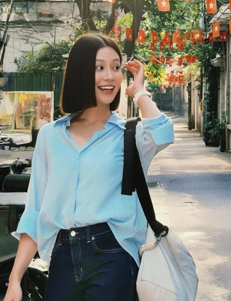 Trong ảnh, nữ diễn viên diện áo sơ mi xanh nhạt phối cùng quần jeans tối màu và túi vải trắng khoác vai, mang lại vẻ tự nhiên, năng động nhưng vẫn nền nã. Hình ảnh này hòa hợp với nhân vật Tú - cô gái hiền lành, chân thành, mộc mạc nhưng ấm áp và tràn đầy sức sống.