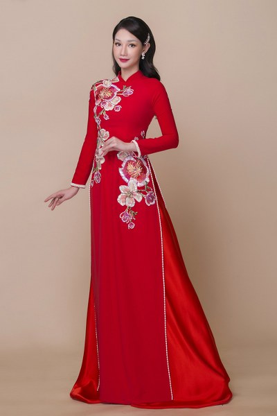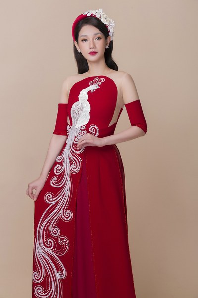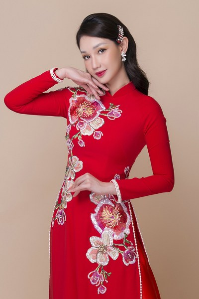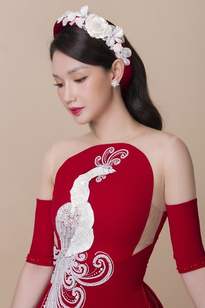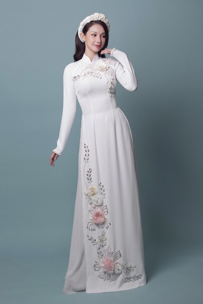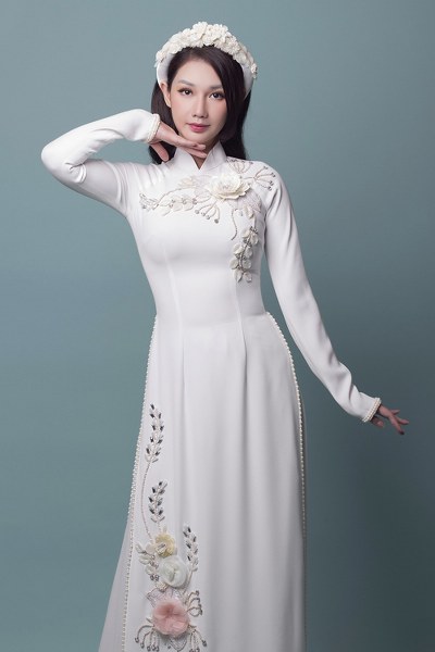 Tấm áo dài mà Quỳnh Chi diện được biến tấu với họa tiết thêu hoa, đính kết cầu kỳ, giúp người mặc trở nên \"nổi bật\" trong mọi khung hình.