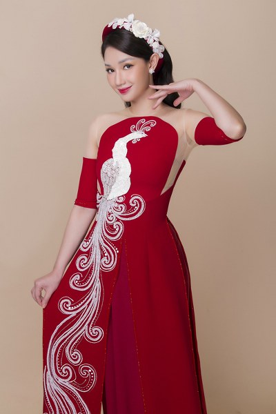 Trên nền áo lụa là họa tiết chim công được đính kết cầu kỳ, giúp mọi người tập trung ánh nhìn vào cô dâu. Đây cũng là họa tiết phổ biến ngày cưới, gửi gắm khát khao hạnh phúc.