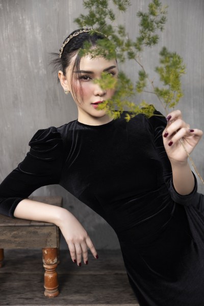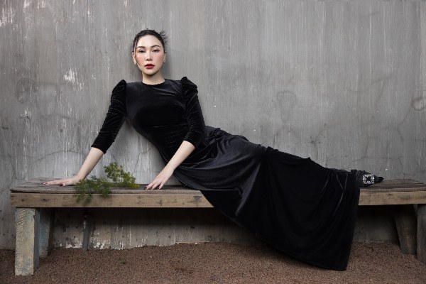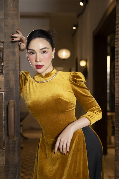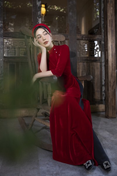 Diễn viên Quỳnh Thư trông nền nã khi diện trang phục truyền thống bằng chất liệu nhung, dáng cách điệu.
