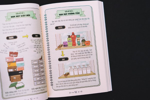 Cuốn sách cũng đi sâu vào từng vấn đề dọn dẹp tại các không gian của căn bếp, phòng khách, phòng ngủ, khu vệ sinh, hay lối ra vào. Từ tuyệt chiêu dọn dẹp không gian sinh hoạt chung chỉ trong 5 phút, cách bố trí căn bếp đa năng – khoa học đến việc hợp nhất phòng ngủ và phòng thay đồ chỉ 1m2 , thiết kế bàn trang điểm vạn năng, cải tạo khu vực nhà tắm, ban công theo hướng tiện ích – hiện đại… Tất cả đều được gói gọi trong gần 400 trang sách có minh họa sống động và dễ tiếp cận với mọi đối tượng độc giả.