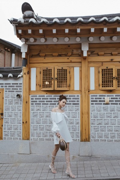 Diện váy trắng yêu kiều và sang chảnh, Sam dạo chơi trên đường phố Hàn Quốc khiến ai cũng ngoái nhìn.