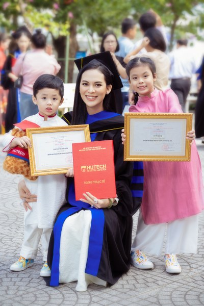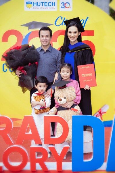 Vừa qua, ông xã doanh nhân và hai con đã đến dự lễ tốt nghiệp, chúc mừng Sang Lê hoàn thành chương trình Cao học ngành kinh tế của trường Đại học Công nghệ TPHCM.