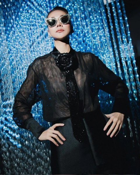 "Chị đại" Thanh Hằng thể hiện khí chất kiêu sa, lộng lẫy trong bộ đồ vải xuyên thấu gồm sơ mi và chân váy tafta đứng phom. Chiếc cà vạt điểm hoa hồng to bản gắn sequins kim sa tạo nét chấm phá thú vị, khiến bộ đồ tăng điểm ấn tượng mãn nhãn. Có thể thấy, phong cách menswear không hề cứng nhắc hay khô khan nếu chúng ta biết phối hợp thêm một vài chi tiết đặc biệt