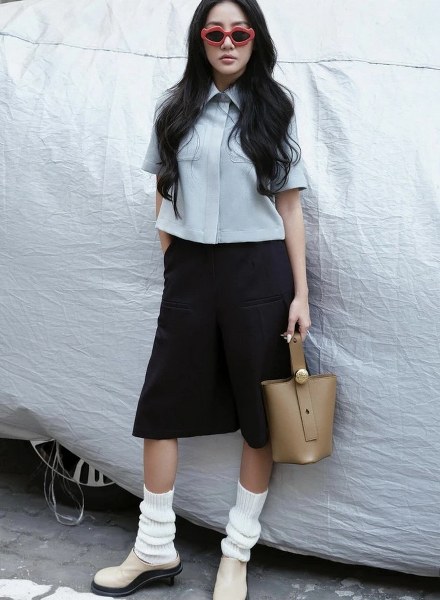 Với quý cô thanh lịch tinh tế, cách "chơi" đồ menswear của họ thậm chí còn tạo cảm hứng cho những người xung quanh. Văn Mai Hương xuống phố đầy tinh nghịch, đáng yêu với chiếc sơ mi cộc tay màu pastel, quần lửng Bermuda, tất ống chân, kính râm gọng lồi của Loewe và đôi giày cao gót lạ mắt