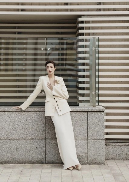 Muốn làm chủ phong cách này một cách nữ tính, thanh lịch, bạn hãy tham khảo lối lên đồ của Á hậu Lệ Hằng. Người đẹp sinh năm 1993 diện bộ trang phục màu trắng ngà nhã nhặn, phảng phất nét cổ điển cao sang. Với phần cầu vai lớn cùng cách thiết kế hiện đại, bộ đồ gồm blazer nhiều nút và chân váy dáng dài của mỹ nhân Đà Nẵng vừa có nét trẻ trung mà vẫn thật sang chảnh
