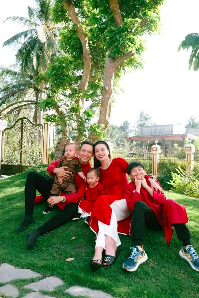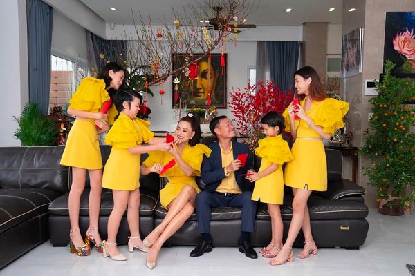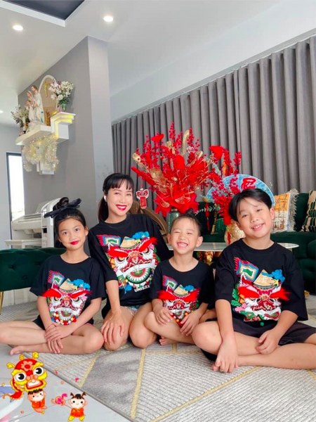 Nhiều sao Việt chọn trang phục ton-sur-ton, áo thun in họa tiết, áo dài cách điệu cho cả nhà khi đi chơi Tết.
