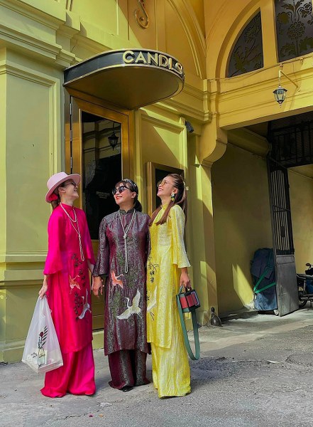 Yến Trang – Yến Nhi và mẹ cùng diện áo dài lụa phom cắt may theo mẫu áo truyền thống với gam mà nổi bật và họa tiết hạc thêu.