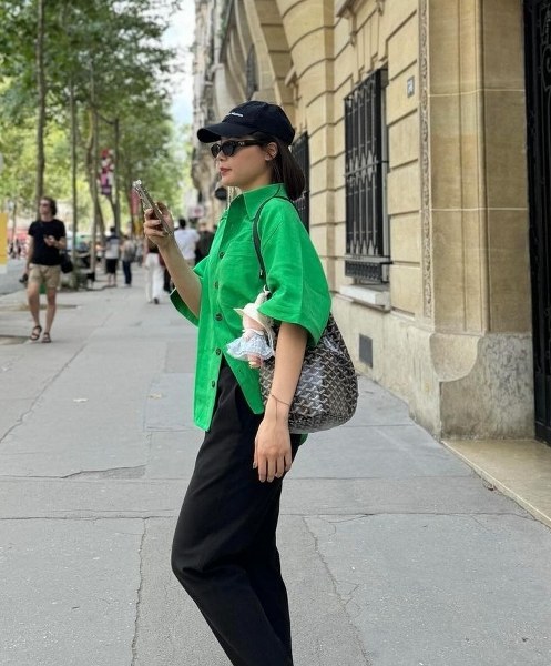Sau thi đấu Olympic, tay vợt cầu lông Nguyễn Thùy Linh dạo phố Paris với sơ mi xanh lá và túi Goyard.