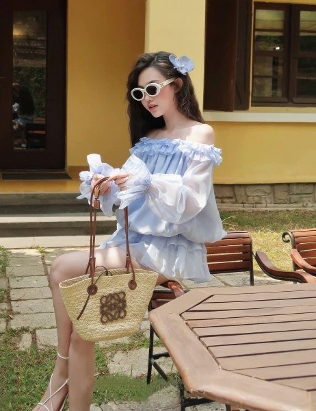 Phối áo cùng túi cói, hoa cài tóc là công thức được một số người áp dụng khi đi du lịch hoặc chụp hình.