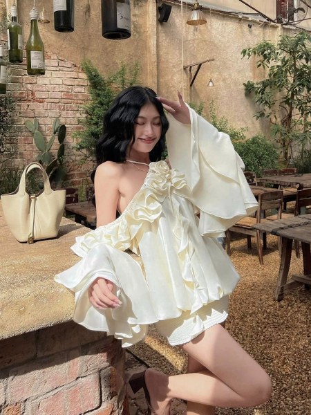 Một cô gái phối áo xếp bèo với dép xỏ ngón khi đi uống cà phê với bạn bè (Ảnh: Ononmade)