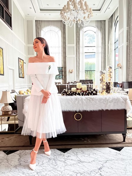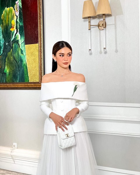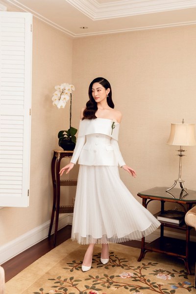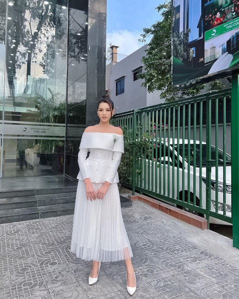 Đỗ Thị Hà phối phụ kiện ton-sur-ton cùng kiểu áo chiết eo, áo trễ vai, chân váy xếp ly vải tuyn của nhà thiết kế Hà Thanh Việt.