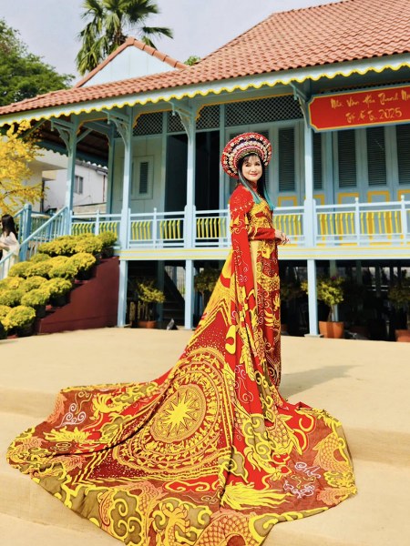Hiền Mai - mỹ nhân ảnh lịch một thời - diện trang phục có phần áo choàng dài của nhà thiết kế Minh Hùng.