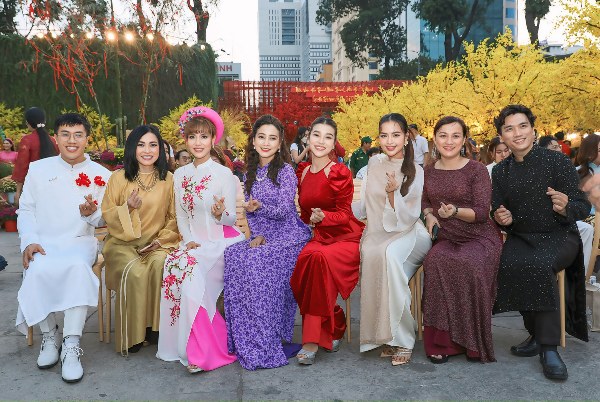 Các nghệ sĩ tham gia buổi khai mạc lễ hội Tết Ất Tỵ do Nhà văn hóa Thanh niên TPHCM tổ chức, ngày 13/1. Điểm nhấn của lễ hội là hàng trăm gốc mai giả kết hợp tạo hình tre nghệ thuật. Làng gốm Lái Thiêu (Bình Dương), làng chiếu Định Yên (Đồng Tháp), làng nghề đan lát Mỹ An (An Giang), gian bếp và mái ngói đỏ Nam Bộ cũng được tái hiện.