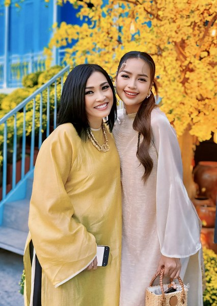 Ca sĩ Phương Thanh (trái) và Hoa hậu Ngọc Châu diện áo dài tạo dáng. Họ cùng hoạt động trong hội "Nghệ sĩ cộng đồng" nên có mối quan hệ thân thiết.