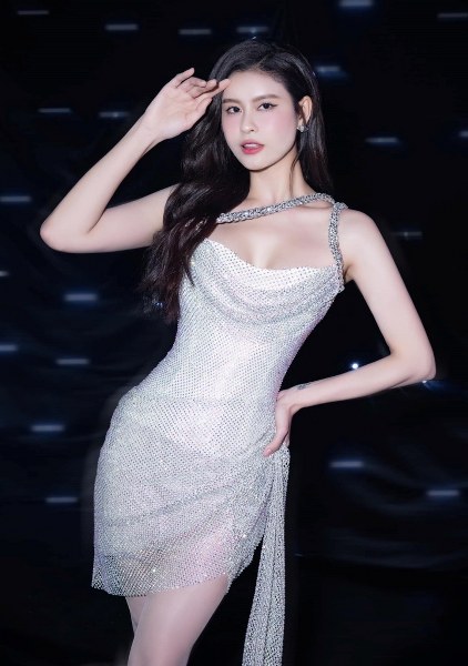 Bảo Ngọc kiêu kỳ với đầm đính đá màu bạc, cổ yếm giúp khoe khéo vóc dáng thanh mảnh. Người đẹp đội vương miện danh giá và không sử dụng phụ kiện.