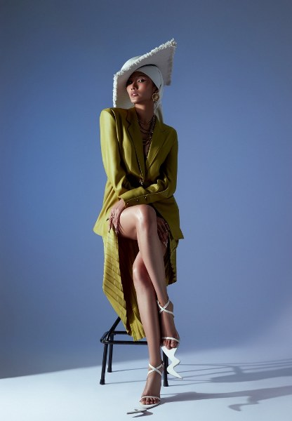 Hoàng Thuỳ đẹp lạnh lùng trong set đồ da màu xanh lá mạ gồm blazer vai vuông cá tính và chân váy xếp ly. Cô phối cùng phụ kiện màu gold, mũ trắng độc đáo và sandals lạ mắt.