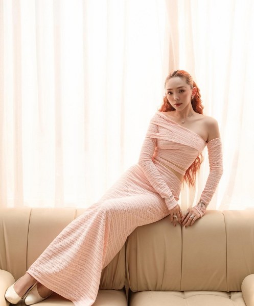 Tóc Tiên yêu kiều trong thiết kế lệch vai, dáng dài màu hồng nhạt với chi tiết cut-out nhẹ nhàng tại eo. Nữ ca sĩ phối cùng giày trắng, đồng hồ dây quấn và bộ nhẫn màu bạc.