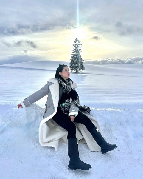 Trong chuyến đi chơi ở Nhật, Chi Pu chọn áo khoác dáng dài lót lông cừu, phối quần legging giữ nhiệt và bốt Chanel.