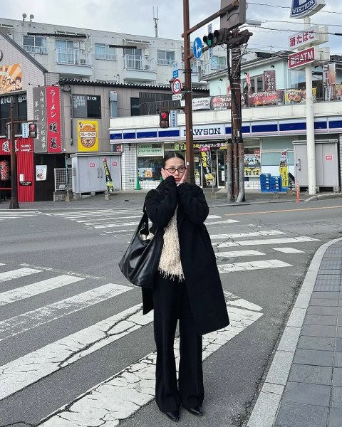 Phong cách dạo phố Nhật Bản của Hoa hậu Phương Khánh, gồm áo khoác dạ dáng dài, quần ống loe, áo len sợi tua rua.