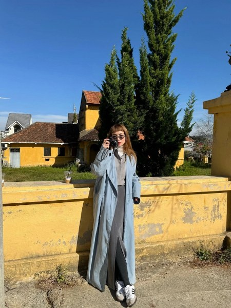 Ca sĩ Yến Trang tạo khác biệt bằng trench coat xanh ngọc, mang sneakers thể hiện vẻ năng động.